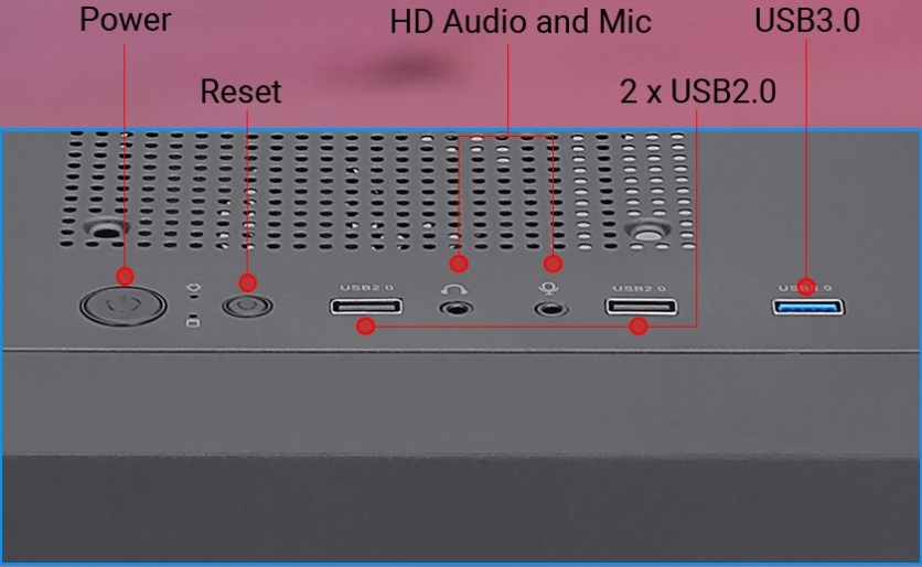 Schneller und einfacher Zugriff auf USB 3.0 x 1, USB 2.0 x 2, HD-Audio- und Mikrofonanschlüsse sowie Ein-/Aus- und Reset-Taste.