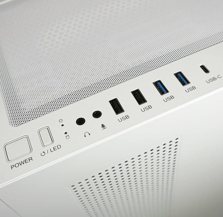 - I/O-Panel mit: 1x USB-C (3.2 Gen. 1×1), 2x USB-A (3.2 Gen. 1×1), 2x USB-A (2.0)