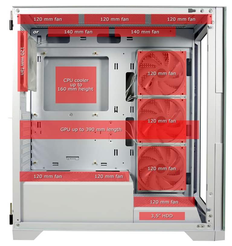 - CPU-Kühler bis zu: 160 mm Bauhöhe