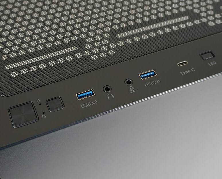 Das auf der Oberseite des Gehäuses eingearbeitete I/O-Panel enthält eine Power- & Farbwahl-/Resettaste sowie einen USB-C- und zwei USB-A-Ports. Zusätzlich finden sich dort der HD-Audio-Anschluss, um entsprechende Audiogeräte ganz bequem nutzen zu können.