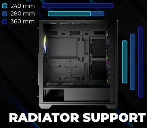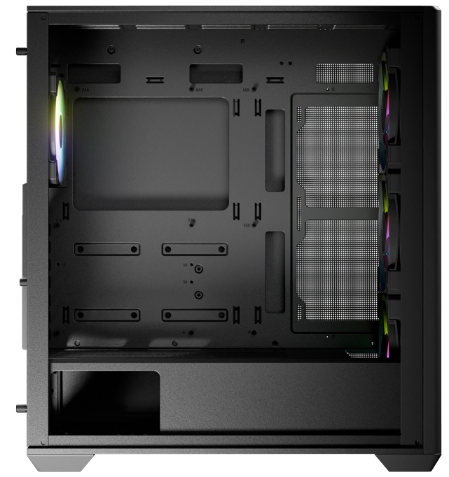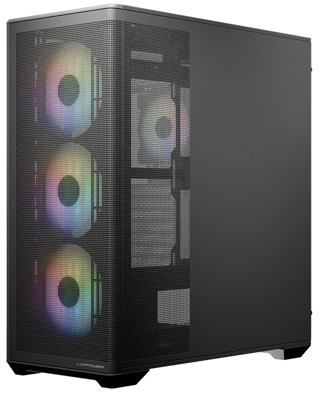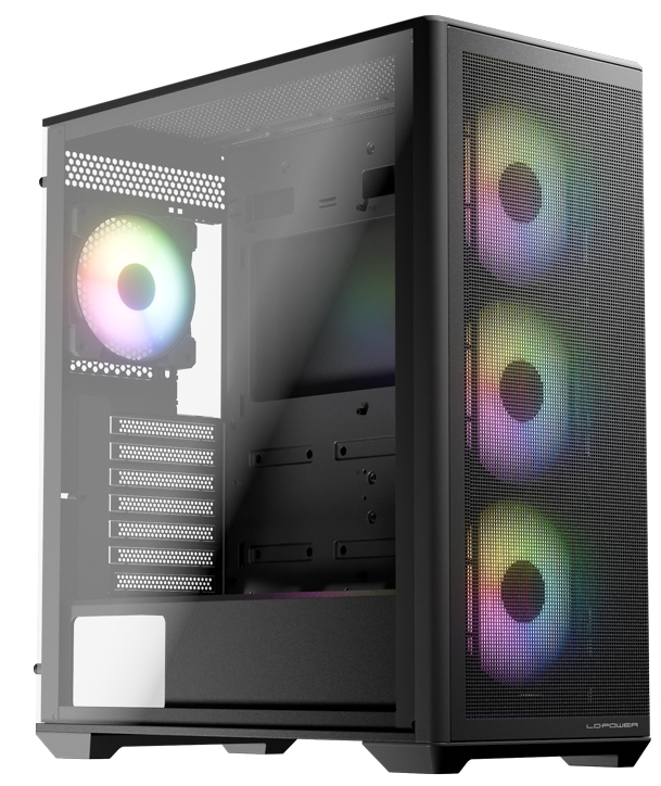 Mit bereits vier integrierten ARGB-Gehäuselüftern (3x 140 mm & 1x 120 mm), wird ab Werk ein besonderer Blickfang geboten. Die gewünschte Farbe kann ganz einfach per Fernbedienung, am I/O-Panel oder durch die RGB-Mainboard-Software eingestellt werden. Wer etwas mehr Farbe in sein System bringen will, kann durch die Seitenscheibe aus Hartglas das Innere des PCs ästhetisch zum Vorschein bringen.