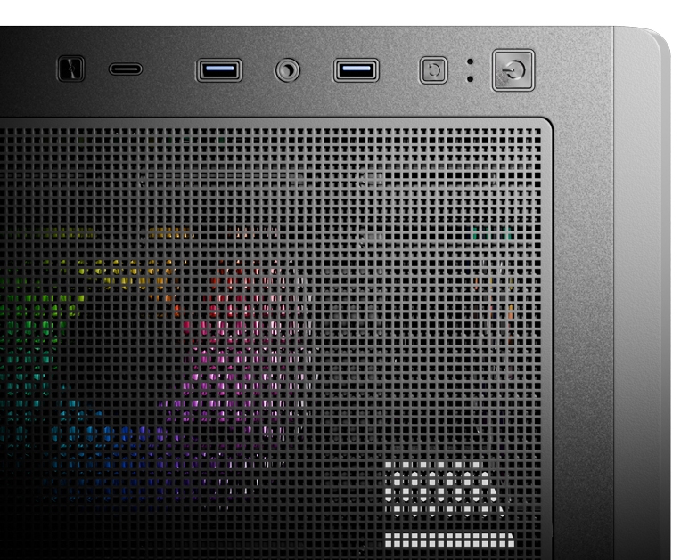 Das für moderne Konnektivität konzipierte vordere I/O-Panel bietet schnellen und einfachen Zugriff auf wichtige Anschlüsse. Ausgestattet mit 1x High-Speed-USB-C-Anschluss, 2x USB-A-Anschluss und 1x HD-Audio-Buchse, sorgt es für eine mühelose Verbindung für Peripheriegeräte, externe Speicher und Audiogeräte.